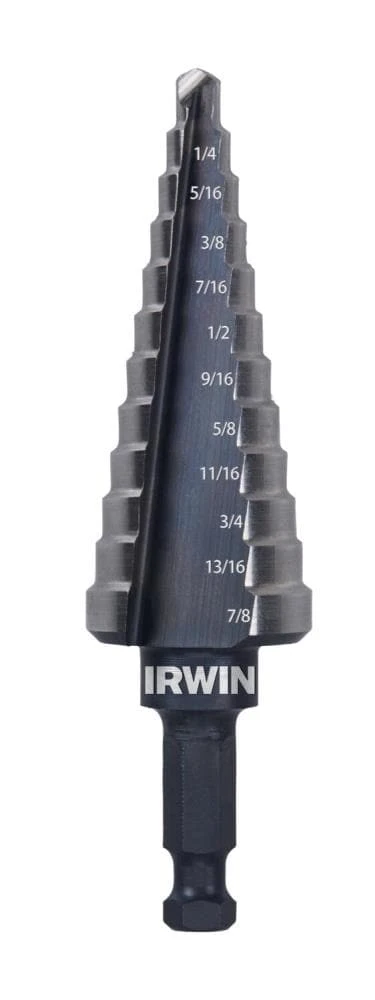 IRWIN Double-Flute Unibit® #4 Step Drill Bits are ideal for drilling holes into thin materials such as stainless steel or sheet metal and offer 2X FASTER DRILLING versus a single-flute design. The dual-flute cutting edges helps to deliver clean holes and 12 defined steps allow for quick drilling of holes from 3/16-in to 7/8-in in diameter.
