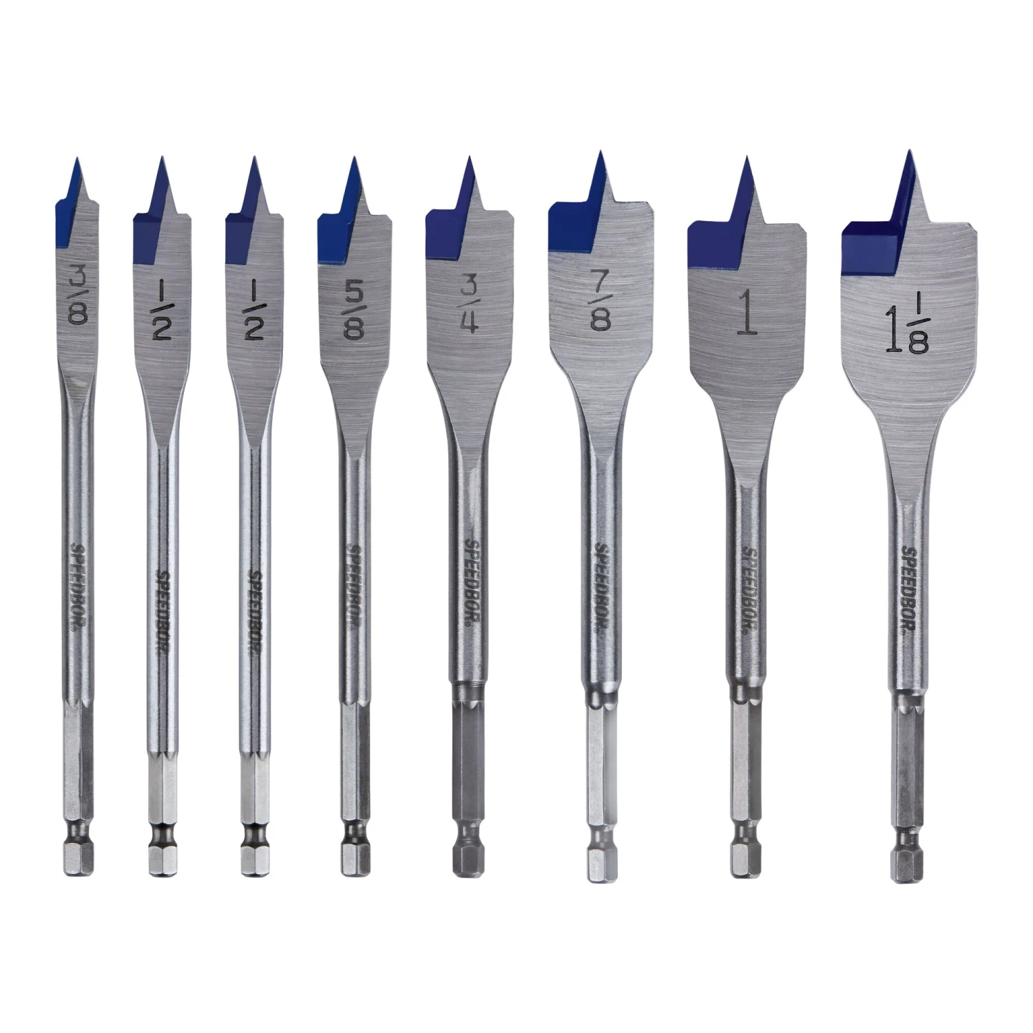 The improved SPEEDBOR Spade Bits now last 2X Longer and cut 2X Faster. Next-generation SPEEDBOR® Spade Bits feature a chamfered cutting edge for durability in cutting wood and optimized point tip that is wider and longer than previous IRWIN spade bits to minimize splintering and control speed. Patented Blue-Groove cutting edge allows for a large cutting area for aggressive removal of wood chips and fast drilling.
